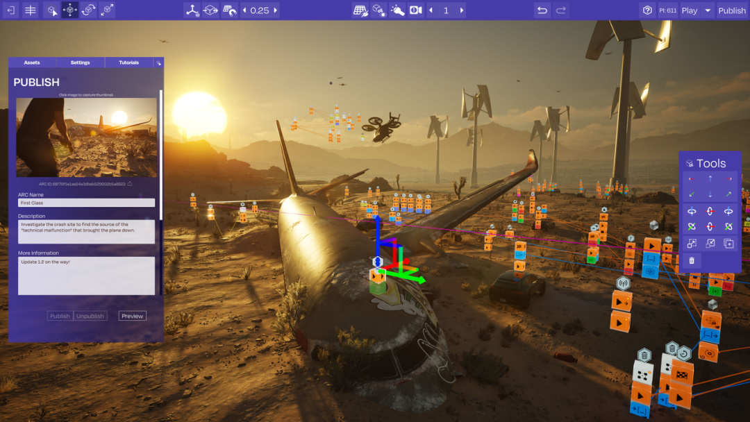 从这一核心功能来看,《Everywhere》在某种意义上甚至能看作“元宇宙概念”版本的GTAOL。在《Everywhere》中,玩家可以在大世界上尽情探索,同其他玩家一道体验各种各样的任务玩法,但更重要的是,玩家可以借由“ARCADIA”制作各种自己的游戏,分享给其他玩家一起来玩或者整活,这也正对应了官方为《Everywhere》所设定的愿景,一个 "超越游戏的数字宇宙"。