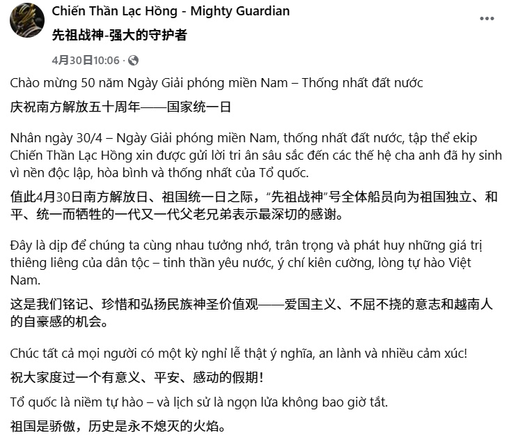 今年4月30日,是越南實現國家統一的50週年。《先祖戰神》在這一天正式推出了第4集“後裔”,其官方賬號也連着發佈了7條動態,慶祝祖國在半個世紀前走出戰爭創傷,重獲和平與獨立。