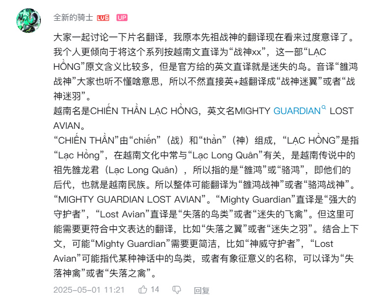 “先祖戰神”這個譯名,據國內的漢化者所言,存在過度意譯的問題。這部作品的片名Chiến Thần Lạc Hồng直譯過來是“雒鴻戰神”,而雒鴻正是越南文化中指代越南民族後裔的神話鳥禽。