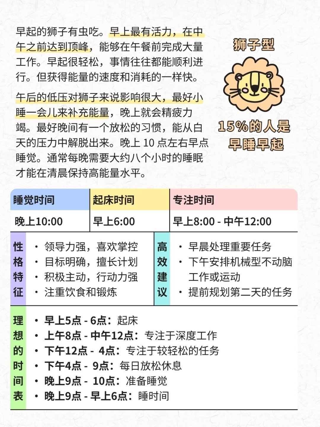 占比约15-20%。狮子型人是早起者,早晨精力最旺盛,晚上很早就感到困倦。早晨是他们处理重要任务的最佳时段,下午精力有所下降。狮子型人通常有强烈的领导力和目标导向性,积极主动,生活方式健康。