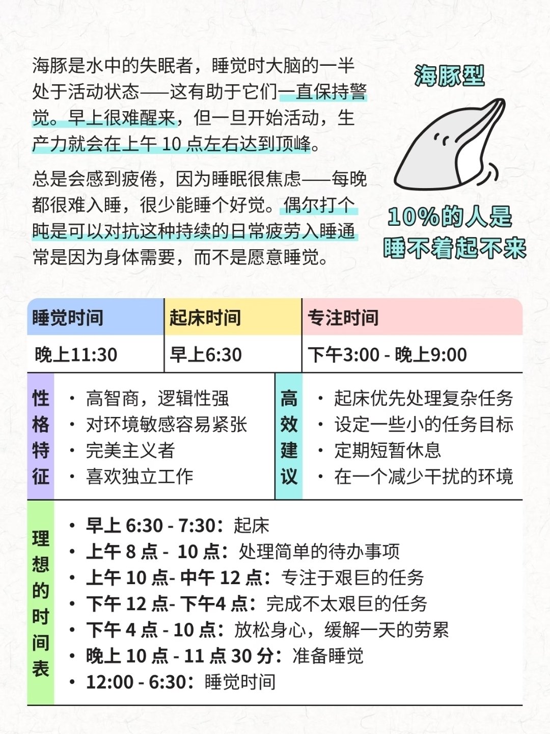 占比约10%。海豚型人容易失眠,睡眠较浅且不规律,经常醒来。他们通常是完美主义者,对细节要求极高。早晨和上午是他们相对高效的时段,适合处理复杂任务。海豚型人警觉性高、独立性强,但也容易感到紧张和焦虑。