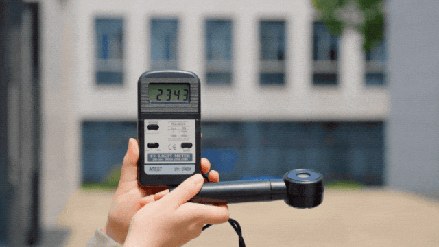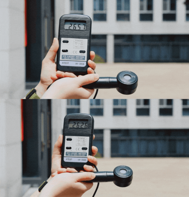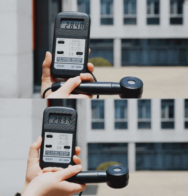 第一件,是我们在电商平台上购入的一件热销防晒短 T ,在初始数值稳定在 2830 左右进行了测试,紫外线穿透遮挡后残余值为 70 左右。