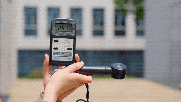 我们选取了两件防晒衣,一件是同事自用,感觉防晒性能相当好的防晒衣,一件是亚瑟士。我们先用仪器测出紫外线的初始值,再用衣物将传感器遮挡,遮挡后紫外线残值越少,说明防晒效果越好。