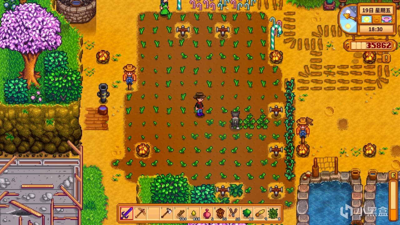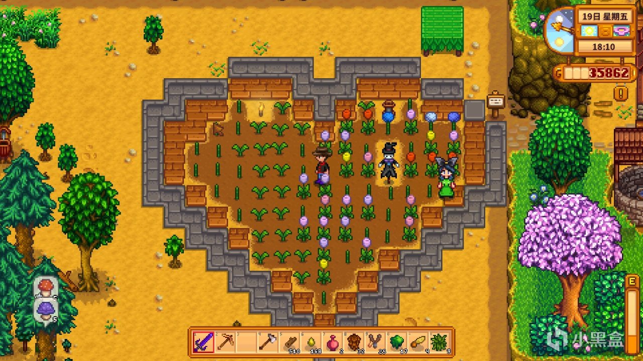 《星露谷物语》是传统意义上的种田,在荒地上用锄头锄地,放种子,浇水,成熟后放到收货箱中,等人来付钱拿走。随着游戏的不断完善,星露谷的种田方面内容十分丰富。