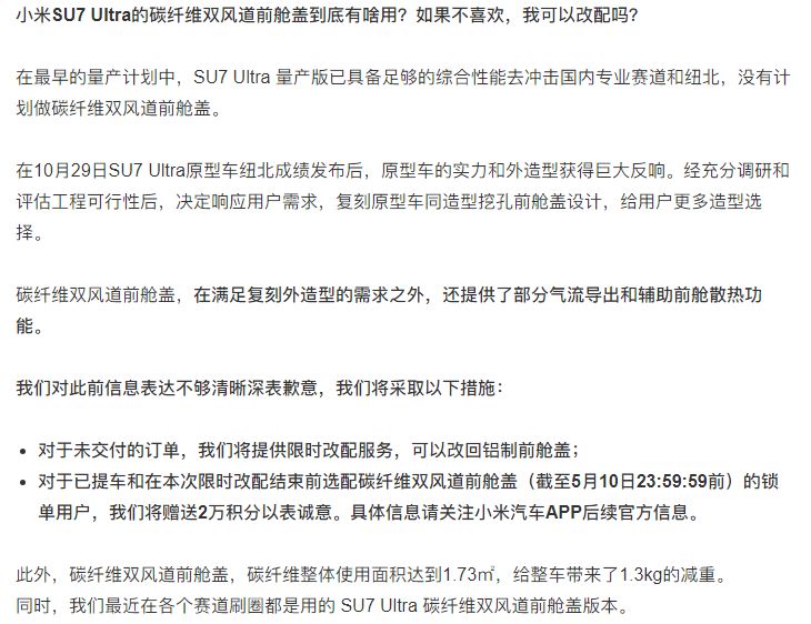 5月7日,小米汽车紧急致歉并推出补偿方案:免费升级全车防爆膜+赠送2万积分(约2000元),但维权车主并不买账。北京车主李先生直言:“我们花百万买的是真碳纤维,不是‘贴膜豪车’!”目前,维权群人数已突破320人,部分车主计划向市场监管部门提交集体投诉。