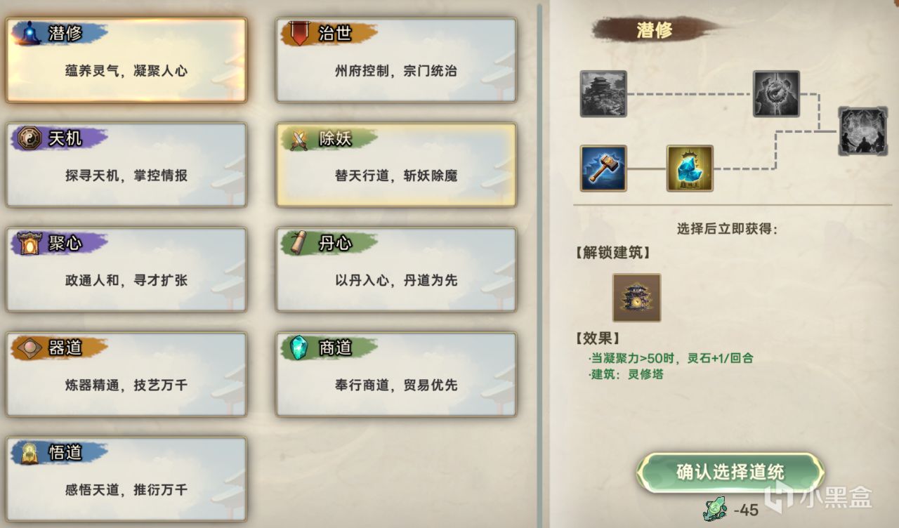 因为每次点开分支的道基消耗都会较大幅度的上涨,而每个项目最后的科技收益又非常高,所以基本上不太适合“博而不精”,所以【道统】可以认为是你的【特化科技树】(相对于悟道的一般科技树)