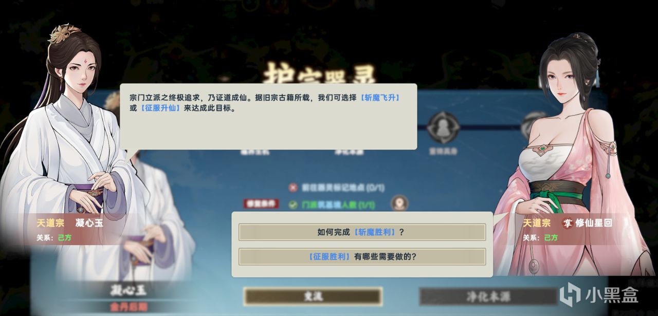 对于目前尚且处于EA版的《宗门志》而言,它的胜利条件显然要窄了很多——目前仅仅只有【征服胜利】(化神之后,征服其他灵山)和【斩魔胜利】两种方式,当然斩魔就是战胜地图的化神级大怪,还是比较能体现修仙世界观特色的。