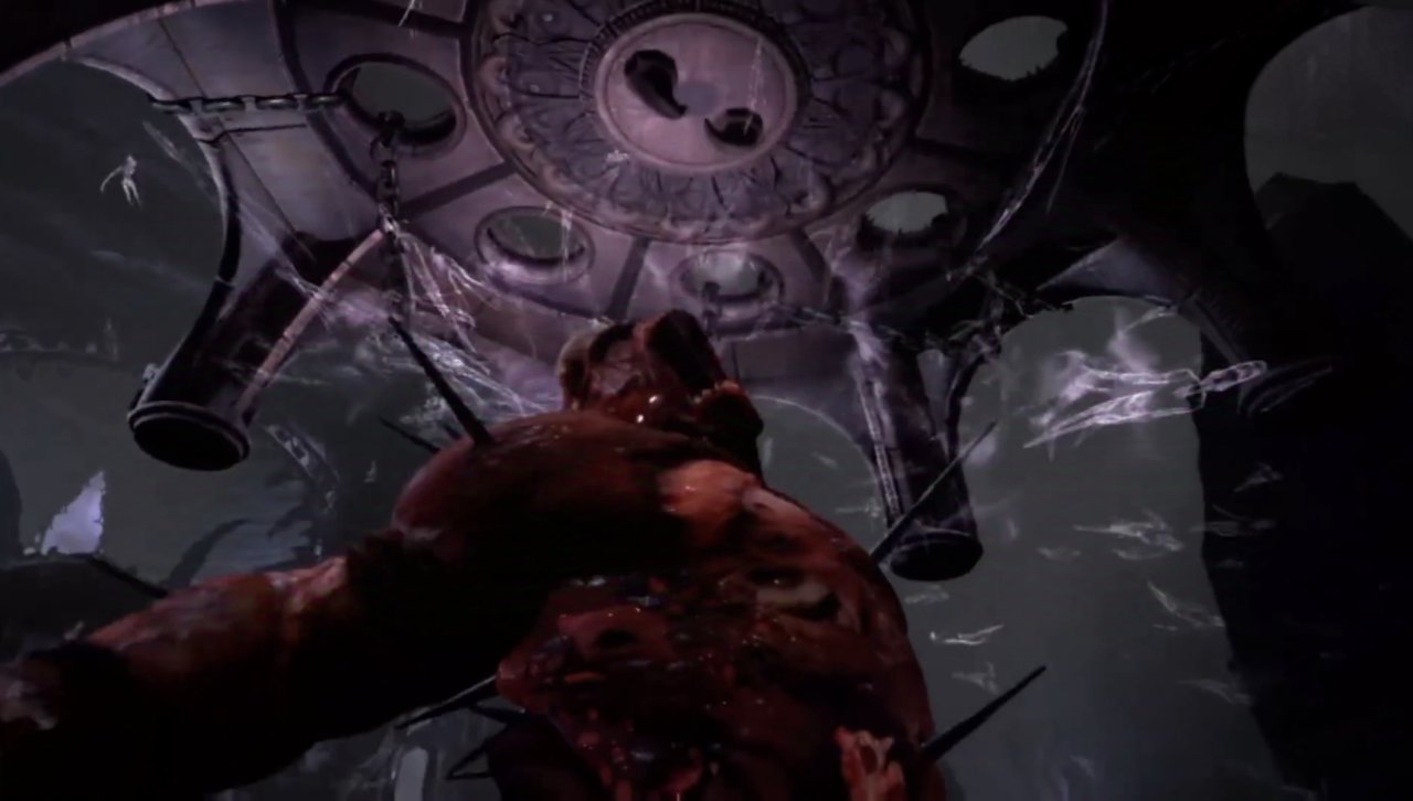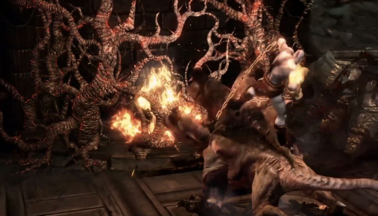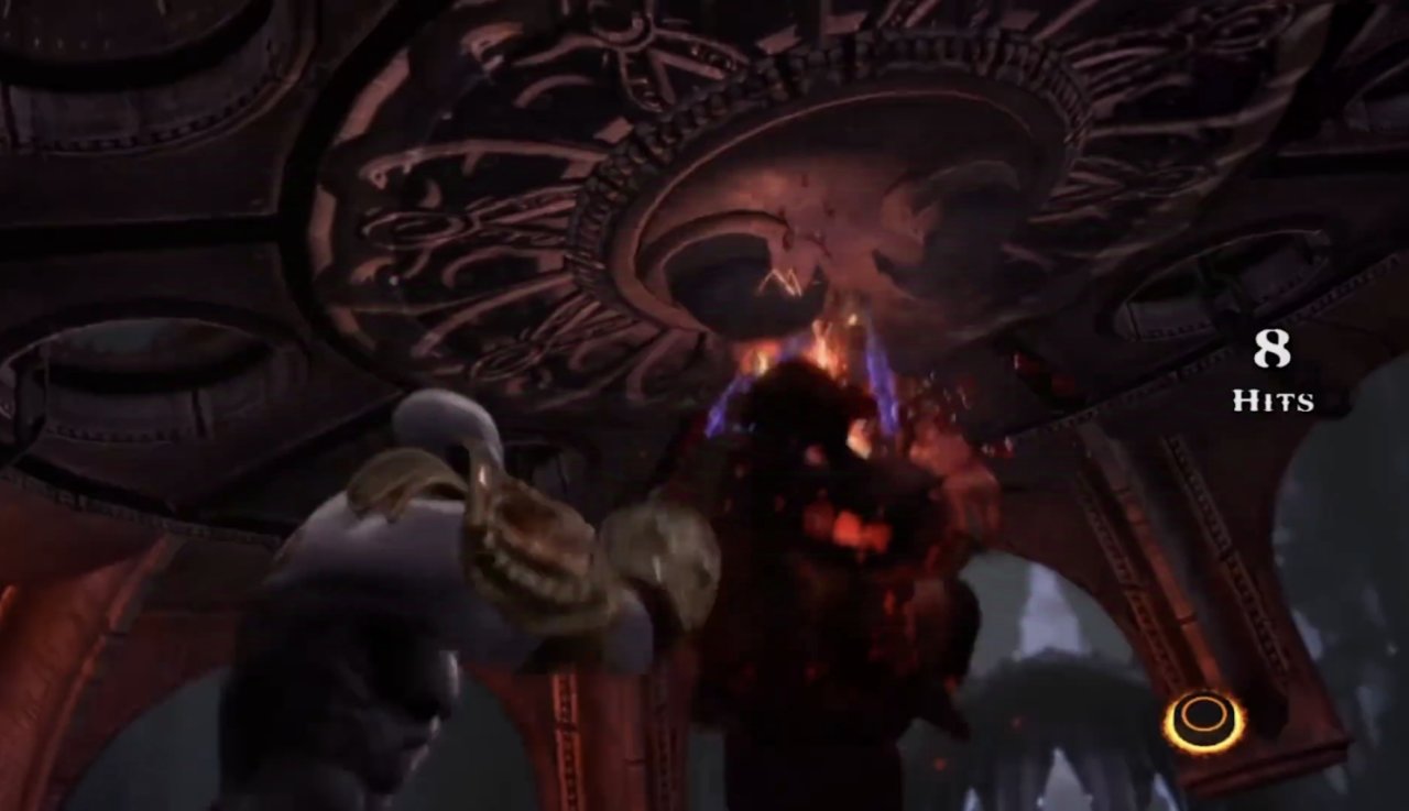 由於二人的武器特性都對對方沒啥太大作用,這場戰鬥很快演變成了單純的力量比拼,趁着混沌之刃與靈魂鉤爪纏繞在一起的一瞬間,奎爺將鐵鏈掛在房樑上、奮力往回一拉,哈迪斯大意之下竟直接被吊了起來,而隨着前者一鼓作氣地不停收放手中鎖鏈,來不及調整的他只能一次又一次被撞在天花板上,逐漸力竭。