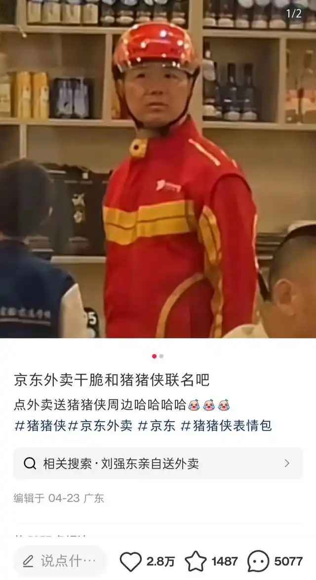 4月劉強東曾穿京東外賣騎手工服體驗配送服務,因工服紅黃配色與豬豬俠形象高度相似,被網友調侃“撞衫”,隨後大量網友呼籲京東與豬豬俠聯名。