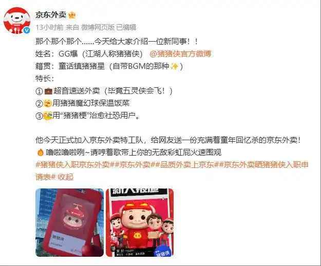 4月28日,京東外賣宣佈與豬豬俠IP聯動,豬豬俠以“豬豬外賣俠”身份入職,成爲虛擬騎手,並推出主題配送車、優化配送路徑的AI算法等創意設計。