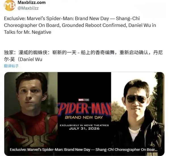據外媒及行業爆料,漫威影業正與吳彥祖接洽,其有望在《蜘蛛俠4:嶄新之日》(2026年7月31日北美上映)中飾演亞裔反派“底片先生”(Mister Negative)。