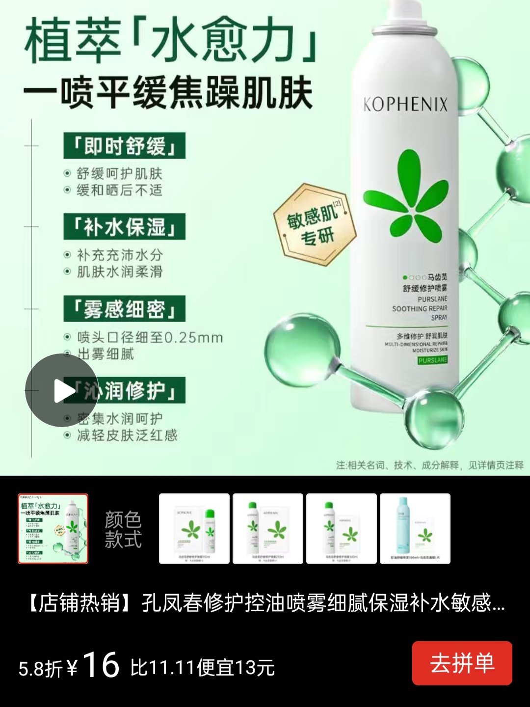 孔鳳春補水噴霧,我手上用完過一大瓶,用了差不多一年,更有性價比,但是據說會有人對其成分中的馬齒莧過敏。