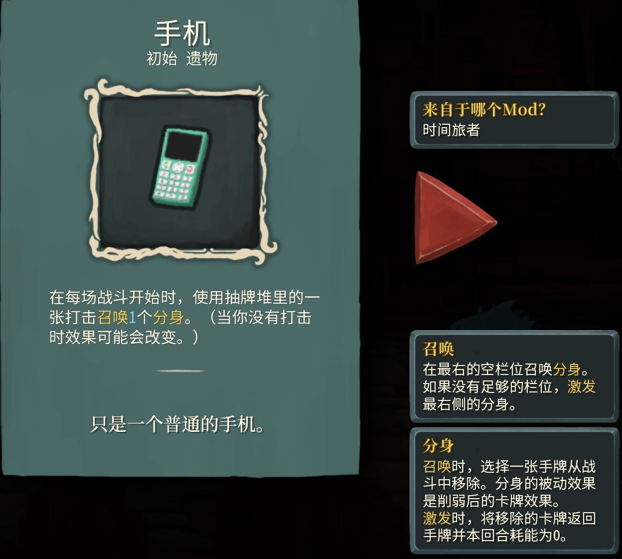 曾立過“完美機器人(往期推薦裏有這個mod的推薦,同樣非常優秀)絕對是我今年玩過的最驚豔的mod,沒有之一”的flag的我,纔剛剛過了不到兩個月,迴旋鏢就打在了臉上。完美機器人震撼的是精妙有趣的玩法,而時間旅者不僅玩法驚豔,就連表現力,代碼力也在不斷刷新着我的認知!這是我在尖塔圈最敬仰的大佬之一——炒飯大佬,尖塔mod的重要奠基者,同時也是意圖狀態機等知名mod作者的最新力作,該模組爲原版遊戲添加了: