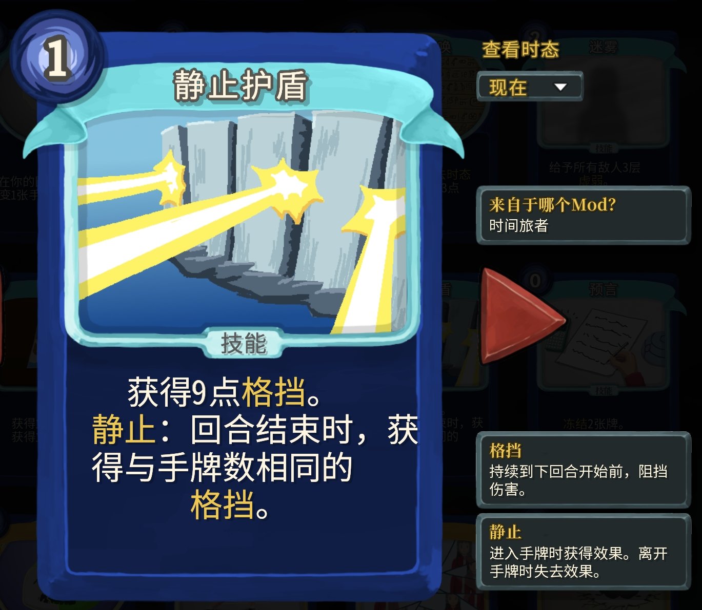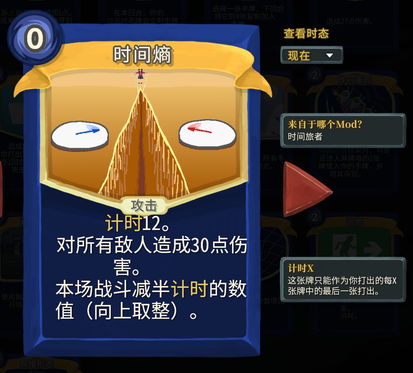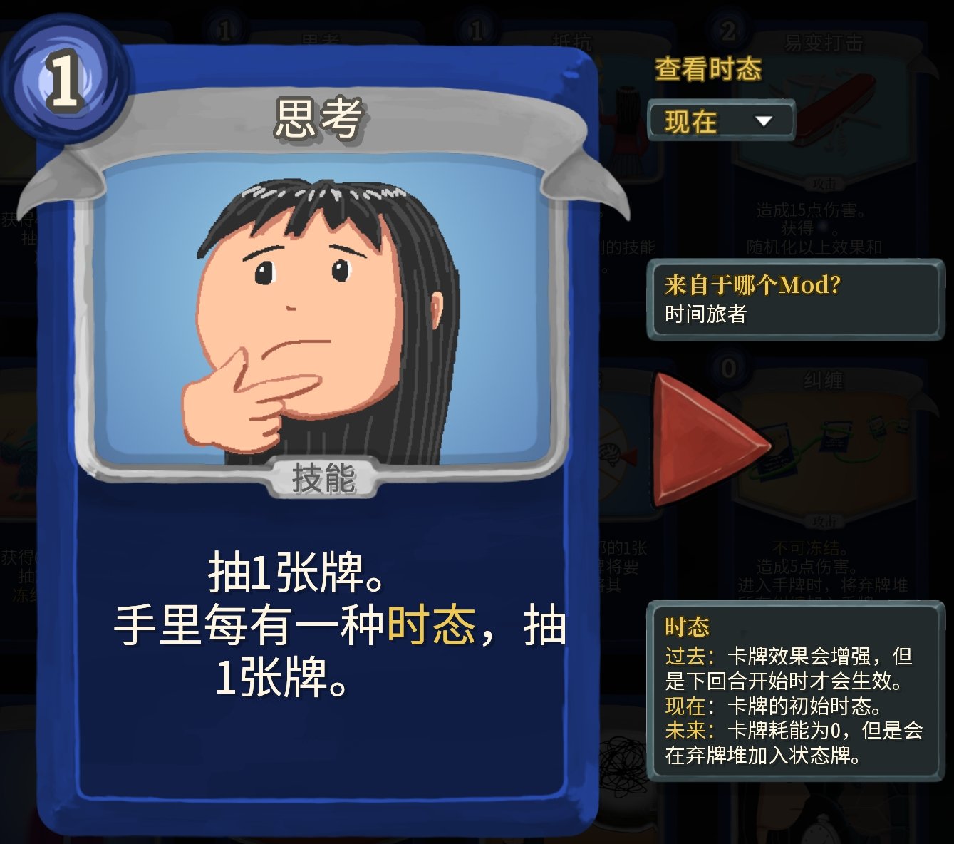 過去時態就是跨回合收益,不過實際遊玩體驗下來,即使是增加了數值,跨回合收益也不是很好用……不過這個mod也有解決跨回合收益不夠好用的牌。而且過去時態的牌打出後就會掛在頭頂,不用擔心忘記你打出了他(又一個玩家體驗拉滿的mod啊)