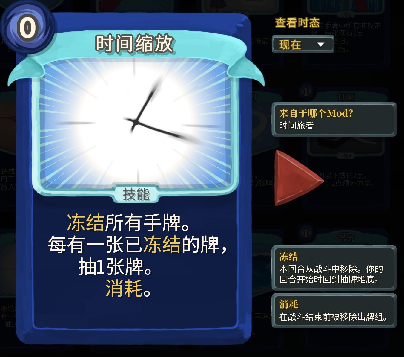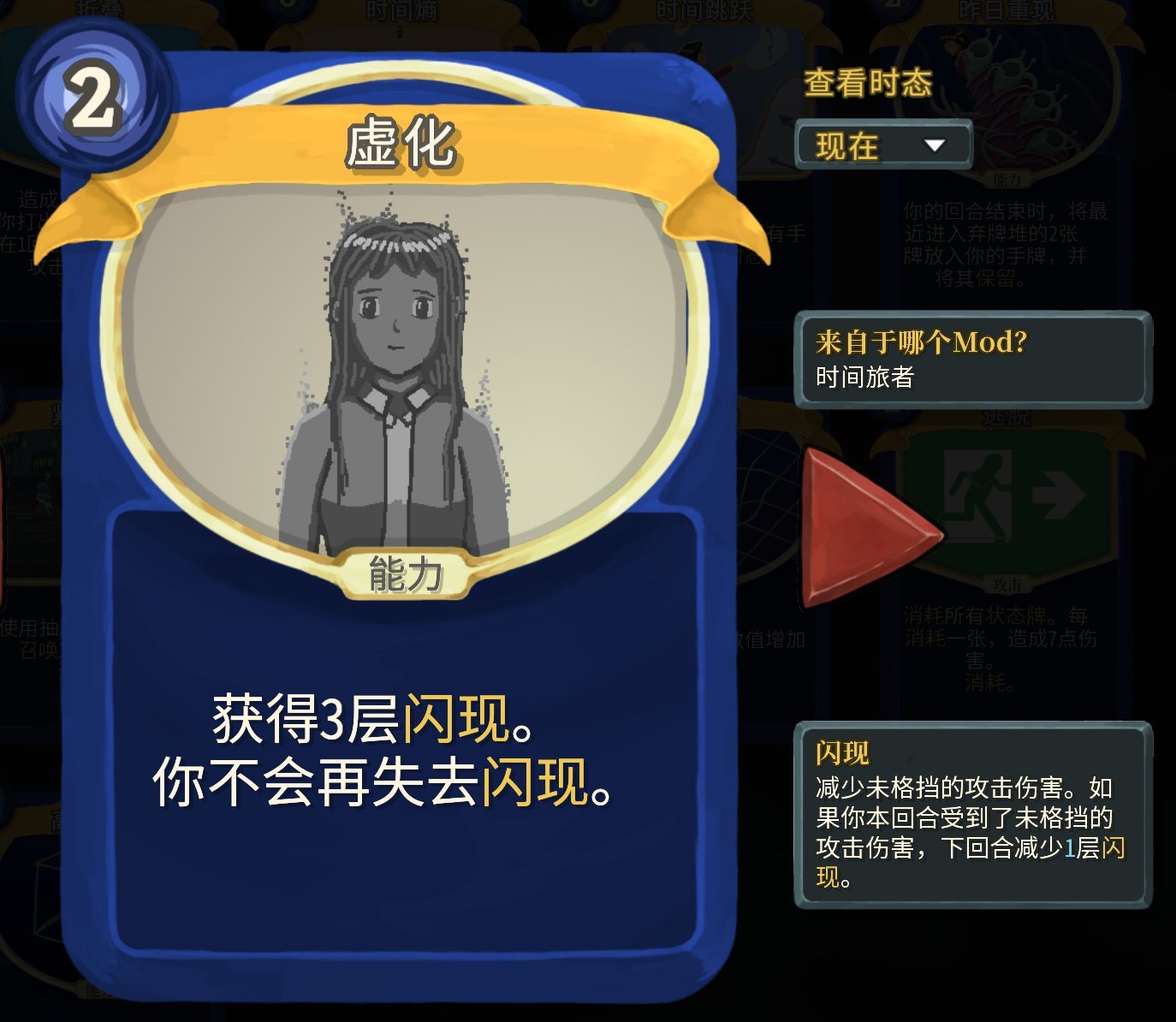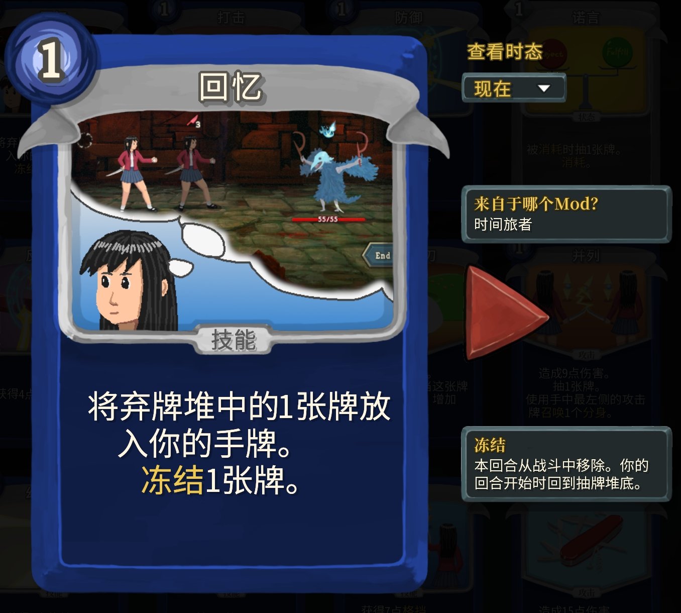 過去時態就是跨回合收益,不過實際遊玩體驗下來,即使是增加了數值,跨回合收益也不是很好用……不過這個mod也有解決跨回合收益不夠好用的牌。而且過去時態的牌打出後就會掛在頭頂,不用擔心忘記你打出了他(又一個玩家體驗拉滿的mod啊)