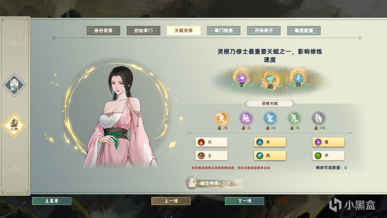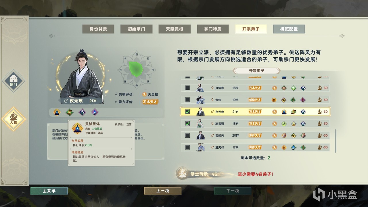 先选择弟子,这里建议收益最大化,选择自带修行速度buff的弟子。选两个,当然如果掌门愿意当无能的丈夫,那么可以选择3个,调整一下前面的天灵根即可