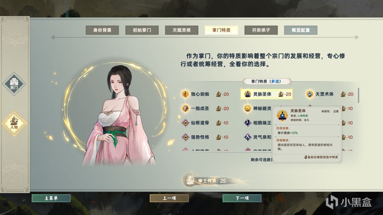 然后回到掌门特质“灵脉圣体”必选,然后花掉剩余的15点点数即可。