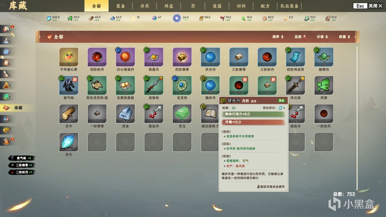 和健步单,这俩便宜不贵前者可以提供10点行动点,而后者只要丹毒不到80,可以疯狂嗑药,也就意味着在一回合光是吃药至多能增加48点行动点。用于跑图和清理周围的妖怪有大作用!