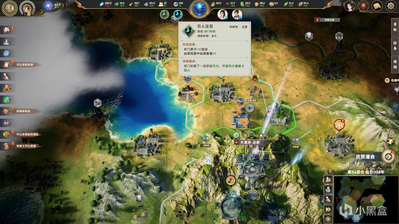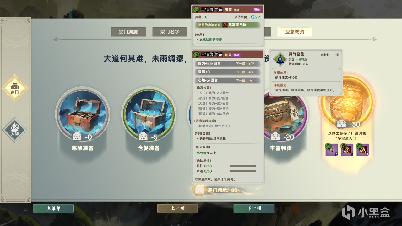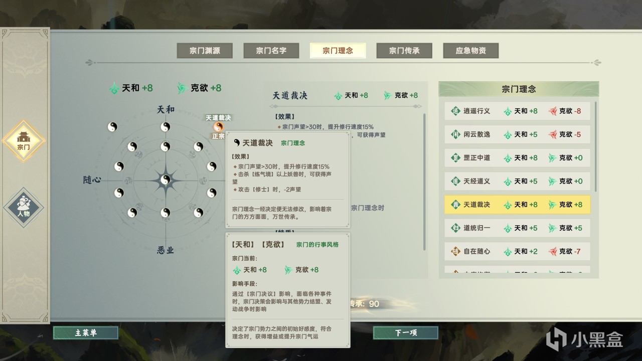 我们只需要将“天和”控制在-3至3之间那么我们的灵山灵气蕴养+1/回合。这点最为直观的体现在于,我们的山门升级会更快,可以更早的解锁4大金刚——“炼丹”、“炼器”、“阵法”、“功法”。