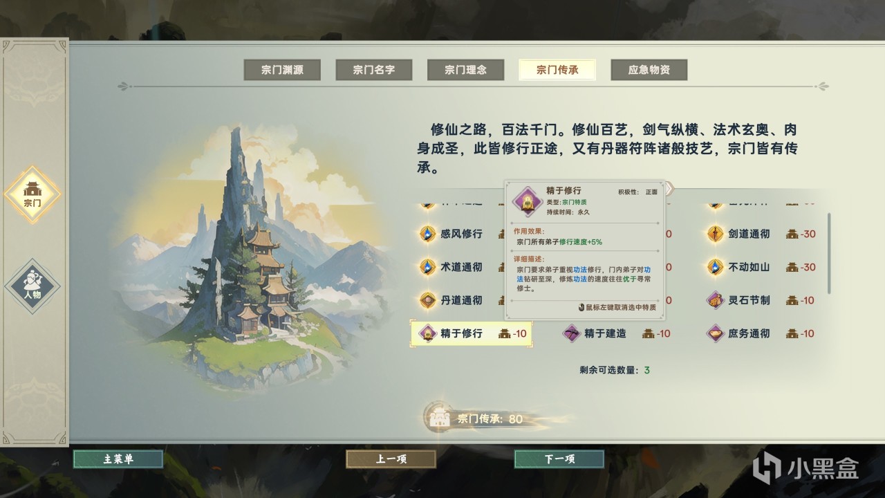 所以在宗门传承中,精于修行他就是必点的!然后可以拿80点点数在里面任选两个贵的特质和一个紫色特质