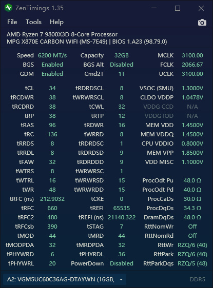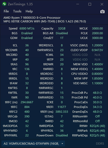 可以明确看到DDR5 6000的频率,主时序为CL-36-40-40-96 电压1.4V。