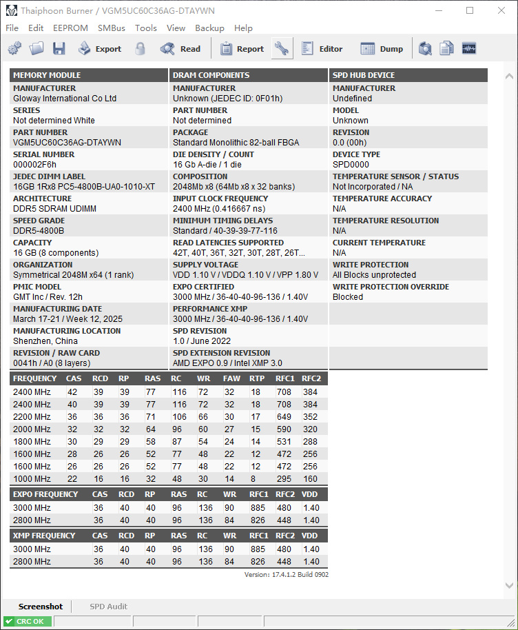 其中我们可以看到它的expo和xmp预设,以及最重要的JEDEC ID