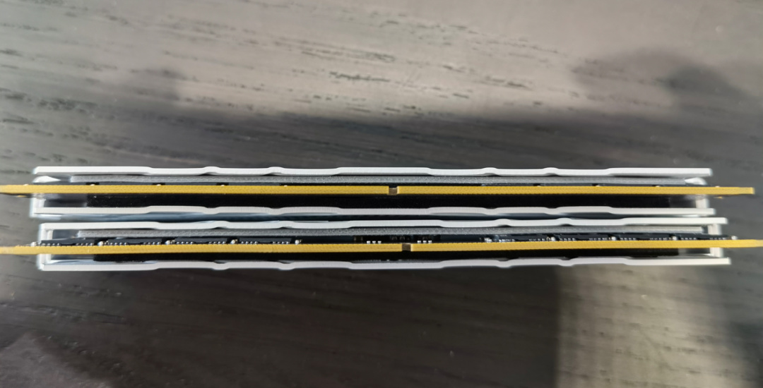 其实在观察天策·奕 这款内存的散热马甲就会发现,光威这对的马甲很薄,在之前的重量对比中也可得知。此外其单面颗粒还搞了很厚的导热垫,厚的同时还没有压紧,这就使得该内存外壳的散热效率进一步缩减。