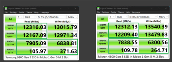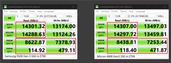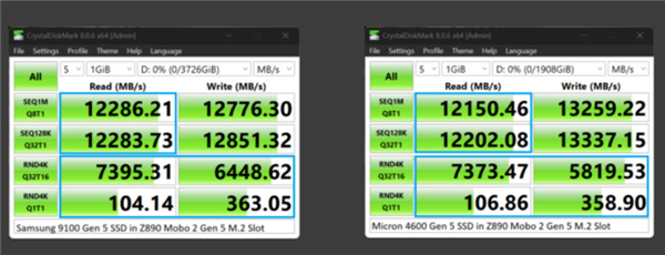在實際測試中,使用三星9100 Pro和美光4600兩款PCIe5.0 SSD搭配Z890主板時,其速度均只能達到12.3GB/s,而在上一代Z790主板上,這兩款SSD則能夠輕鬆達到14.3GB/s的峯值速度。