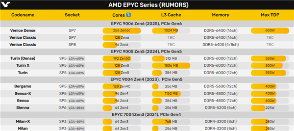 Zen6部分又分爲兩種,一是SP8封裝接口,每個CCD 12核心,總計最多96核心192線程,支持4/8通道DDR5-6400,熱設計功耗350-400W。