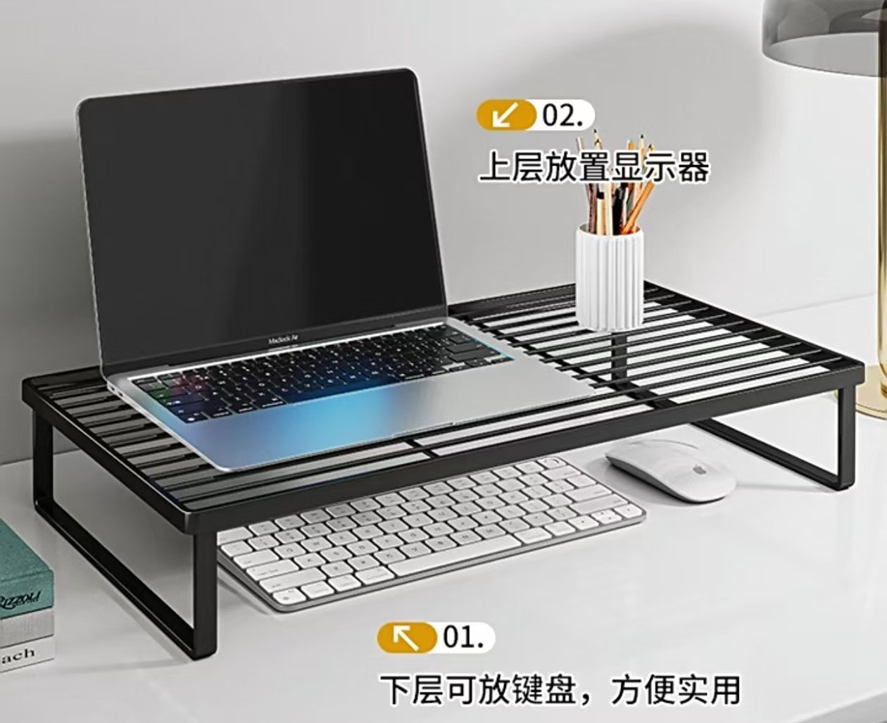 烧烤架的优势主要是下面可以摆放键盘,不容易积灰。如果需要可以升级成木质的,这个在桌搭里面运用的很多,但一般都是只留了一些空间,和烧烤架的散热效果还是有差距。