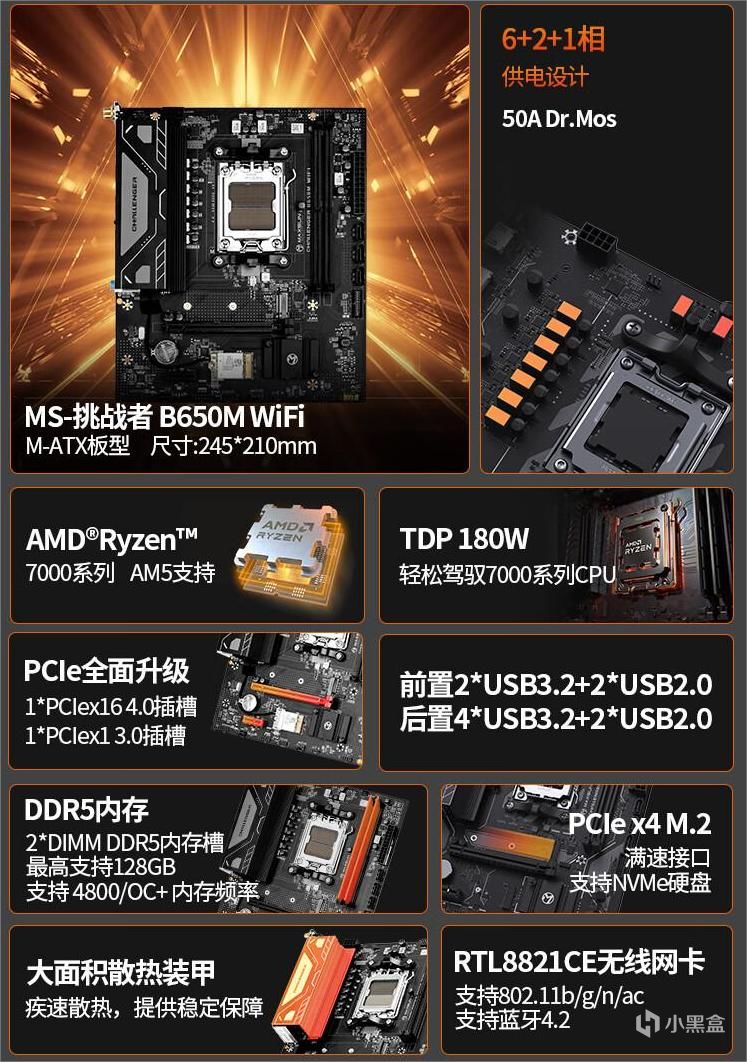 6+2+1相50A Dr.Mos供電,帶7500F和9600X應該都是遊刃有餘的。而且也是平價主板中散熱裝甲給的比較足的,可以作爲1080P主機的一個主力選擇,美中不足的是網卡是RTL8821CE,可以考慮買普通版自己加,也有網卡插槽。