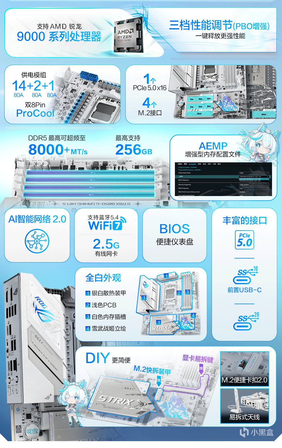 小吹雪自ROG DAY公佈以來,關注度一直居高不下,可以說是當下的最強B850 MATX主板,不但顏值出衆,接口設計也非常合理。還包含14+2+1相80A Drmos供電/AEMP/WIFI7/快拆等豪華配置,截止到目前都是拼手速的狀態,希望在年中大促期間供貨量能上來。畢竟4個M.2插槽的MATX,又有雪武戰姬加持,誰能不愛呢?