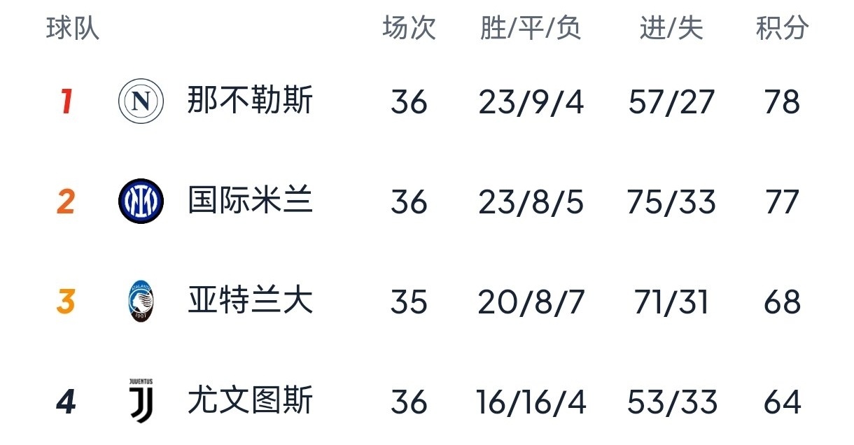 意甲是目前夺冠形势最为焦灼,截至目前,那不勒斯和国米分差仅1分。