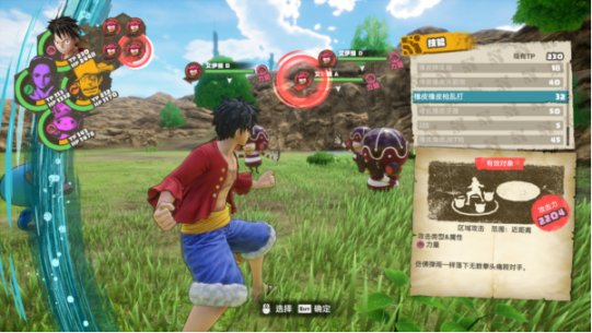 玩家還可以設置不同的戰鬥隊形,比如讓三大主力各領一方,喬巴娜美負責干擾回覆;也可以選擇絕境大神烏索普大神在遠處輸出,進行單點式的收割。在戰鬥過程中,玩家可以使用效果不同的機關球麻痹或者傷害敵人,也可以選用各種精心製作的料理回覆HP和TP。