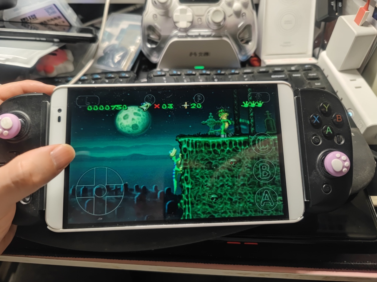 依次安裝了FC、GBC GBA NDS MD SFC 3DO PS1 SS DC PSP等當年主流平臺的模擬器,均可以流暢運行。隨便來個拉伸手柄手持的感覺很好。