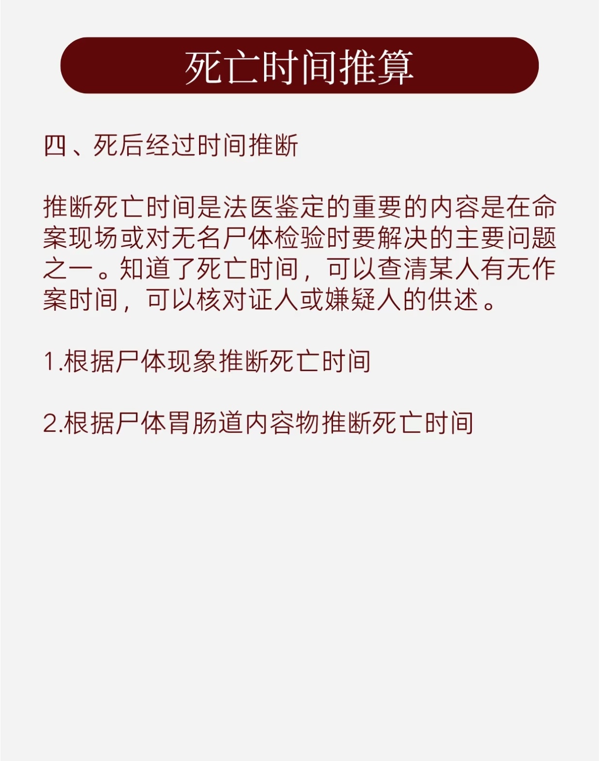 - 根據最後一餐的消化程度推斷:胃內食物未消化(死亡在餐後1–2小時內);部分消化(3–4小時);胃排空(4–6小時後)。