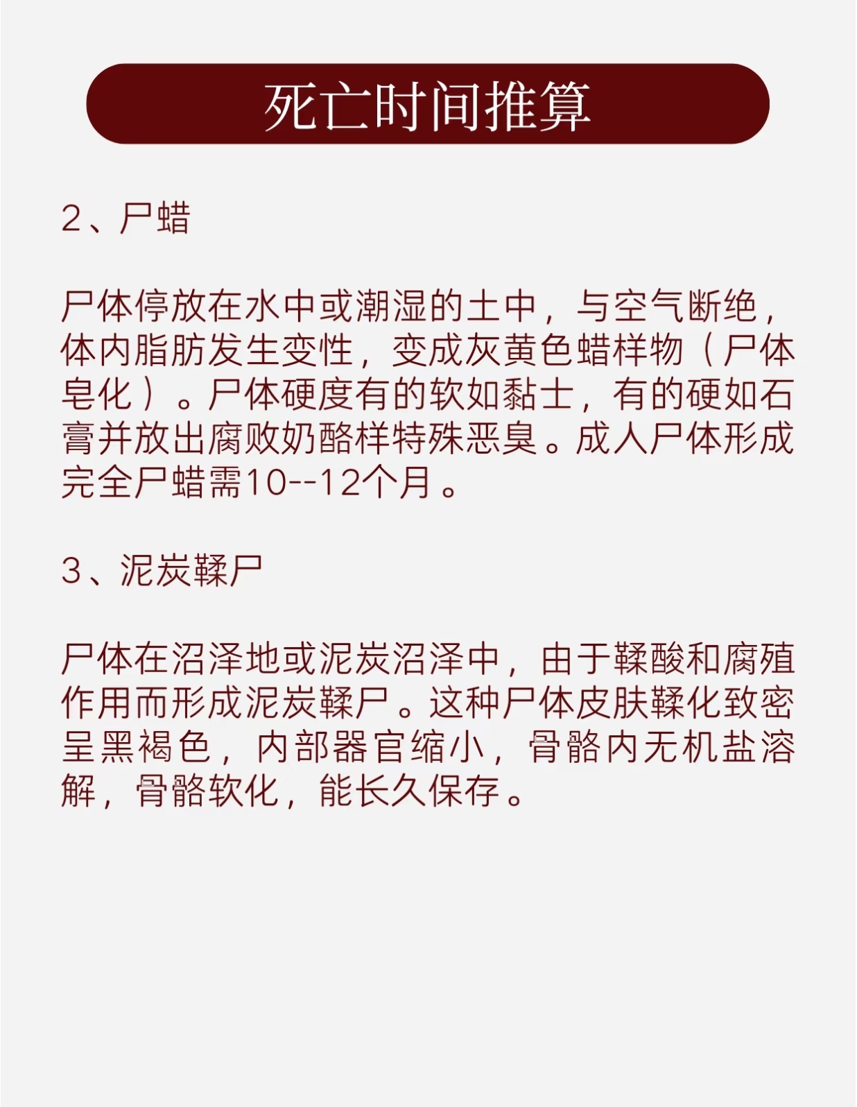 介質:水中屍體腐敗速度慢於空氣,但易被水生生物破壞;土中屍體腐敗速度因深度和土質而異。