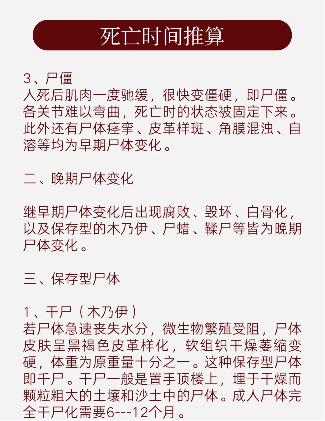 - 死後1–3小時從下頜、頸部開始僵硬,12小時全身僵直,24–48小時後逐漸緩解。