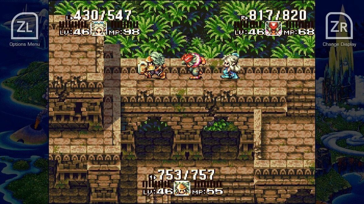不同于原版2D像素俯视角形式,重制版采用了类似第三人称射击的追尾3D视角,配合俯视的场景地图,这种表现方式使得战斗的临场感大大增强,但是限于视野范围,不能很好地掌握战场全局,对于习惯原版战斗形式的玩家来说,利用俯视角实现的满地图转圈跑放风筝这样的技巧,在重制版里就很难实现了,更多的时候需要在较小空间里和敌人面对面,利用连续技和闪避来击败敌人。