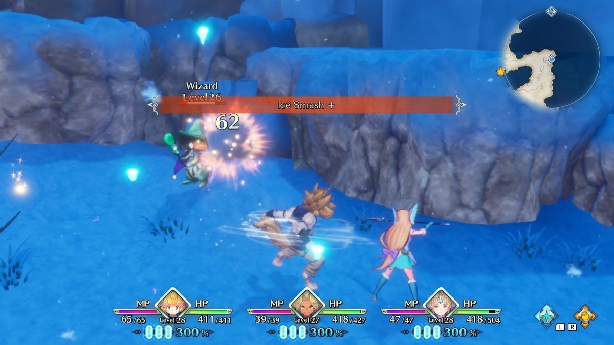 游戏的基本玩法仍然延续了系列经典的俯视角动作冒险,尤其和前作《圣剑传说2》非常相似,实时战斗系统在环形菜单的支持下,玩家可以快速访问魔法、物品和角色信息,以及各种选项,每个角色都有单一种类的武器可供选择,而快捷使用道具栏和仓库之间的切换也非常方便,类似之后我们非常熟悉的《暗黑破坏神》(Diablo)。