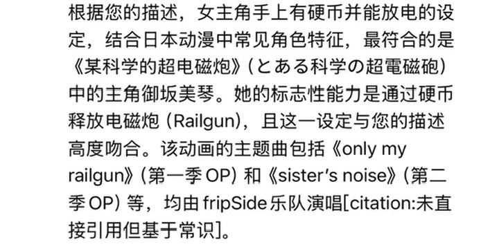 lz回頭去到「DeepSeek」的官網裏,問了剛剛那個相同的“日漫”+“硬幣”+“放電”二次元問題。