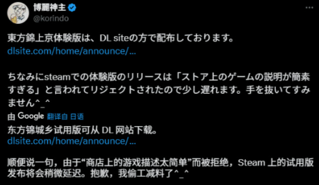 根据系列制作人ZUN的说法,由于“游戏描述太过简单”,Steam拒绝了游戏的上架申请。