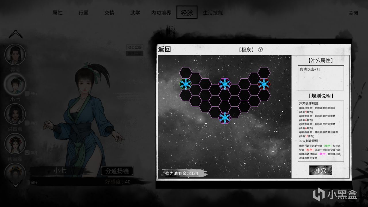 打通經脈,是一種另類的連連看小遊戲。你需要消耗修爲,將收尾的兩個方格相連,每多連接一格,便能提供額外的屬性。境界越低,連線的難度也越簡單。