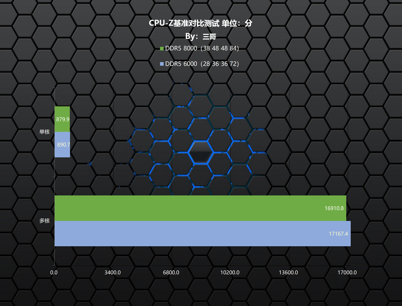 在該測試中,高頻率相較低時序,單核和多核性能均有小幅度的落後。