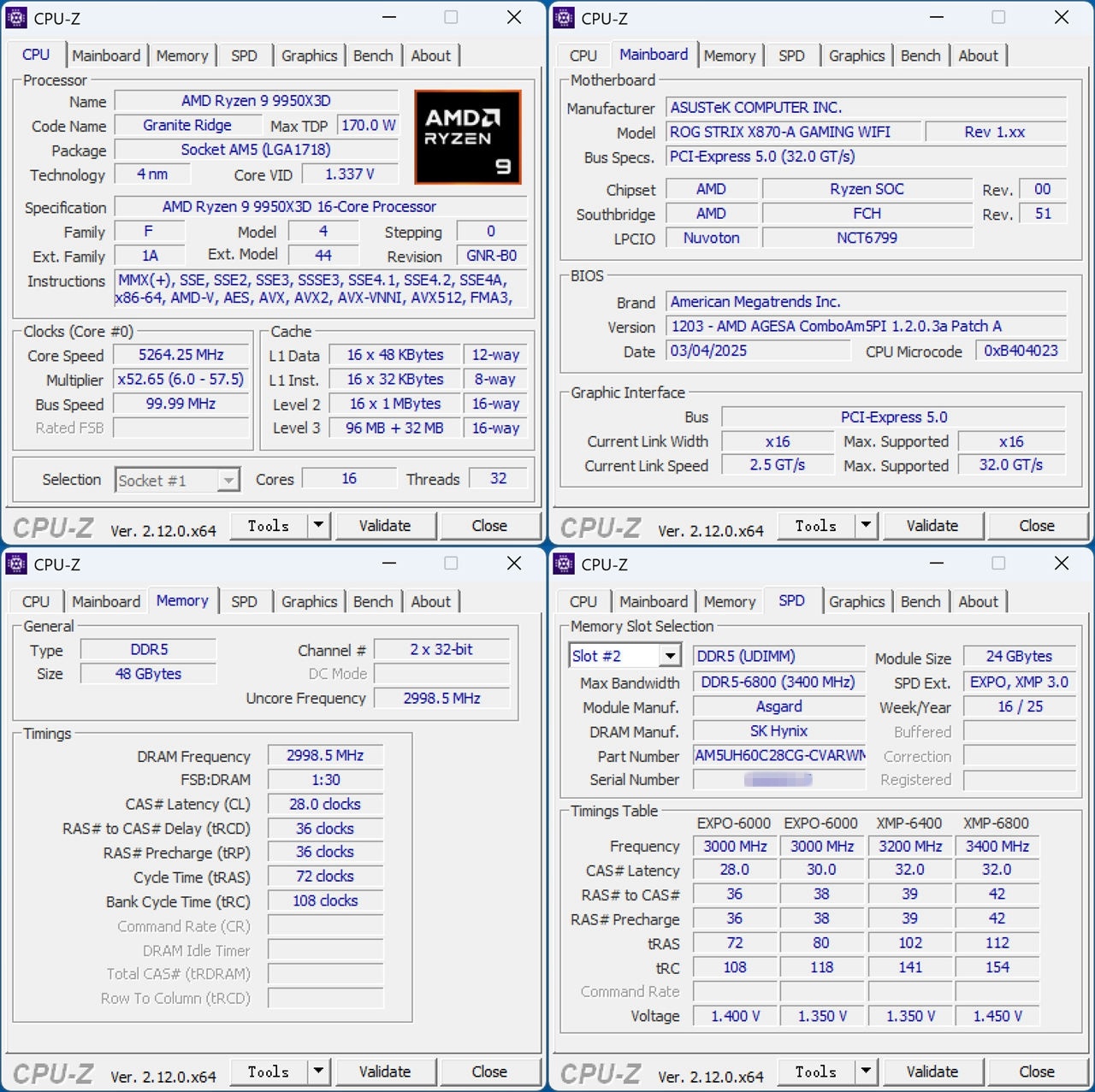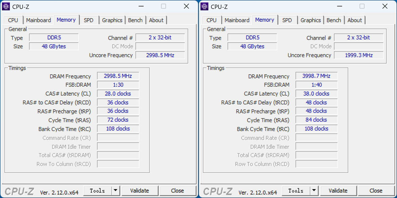本次測試,我們低時序組採用的是EXPO 6000MHz(CL 28-36-36-72)檔,高頻率組直接採用超頻的方式實現了8000MHz(CL 38-48-48-84)的高頻。