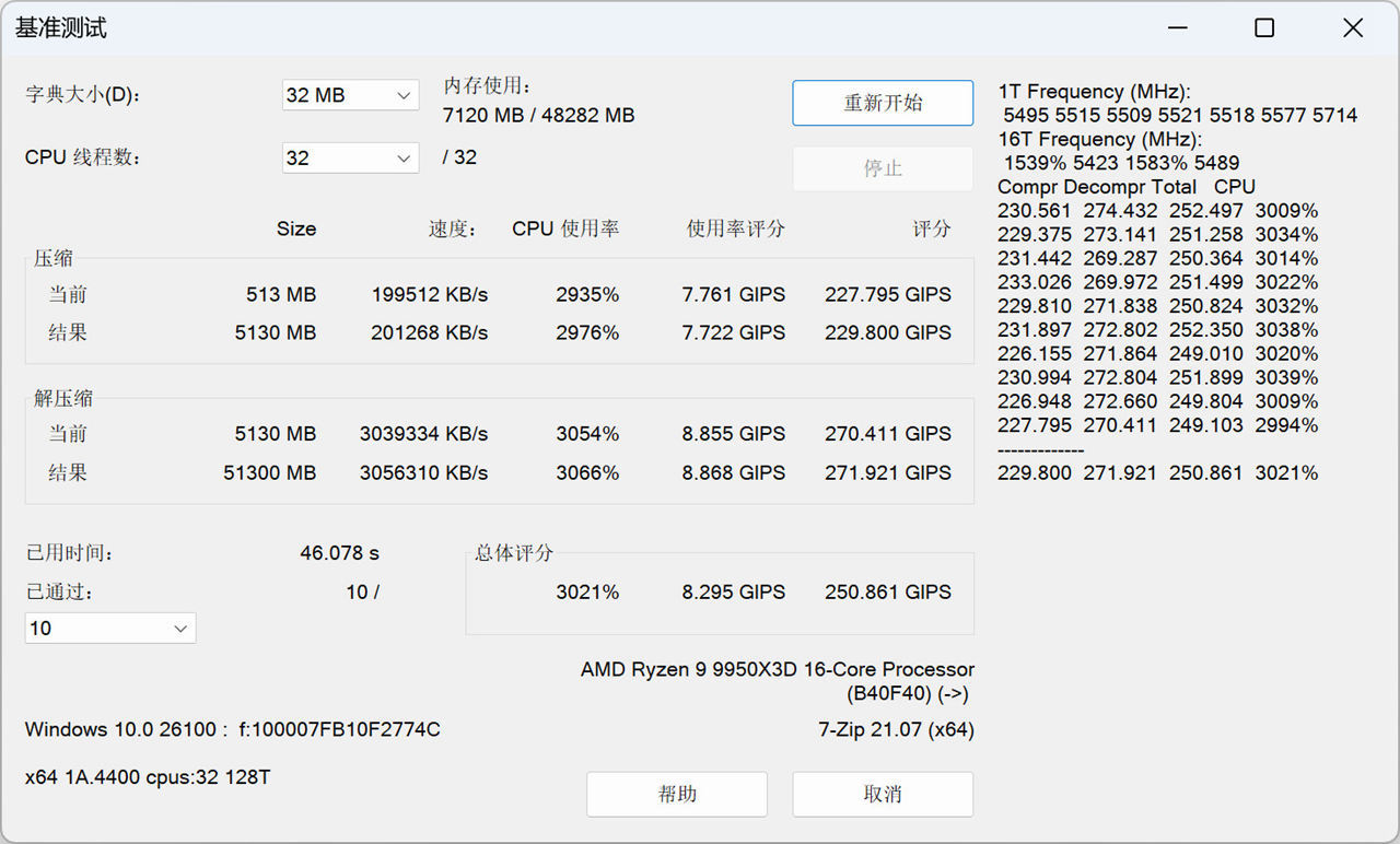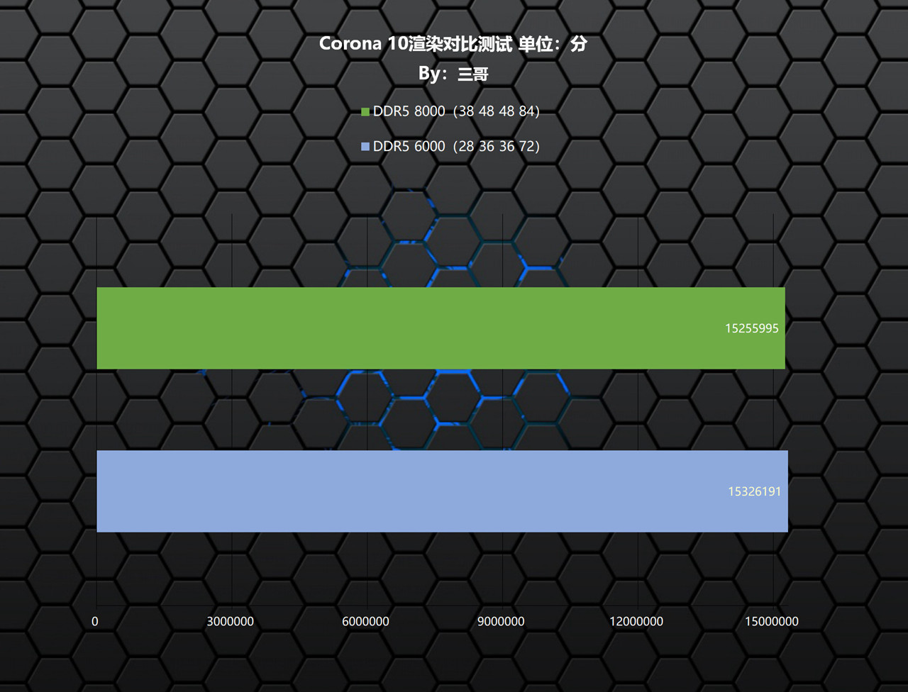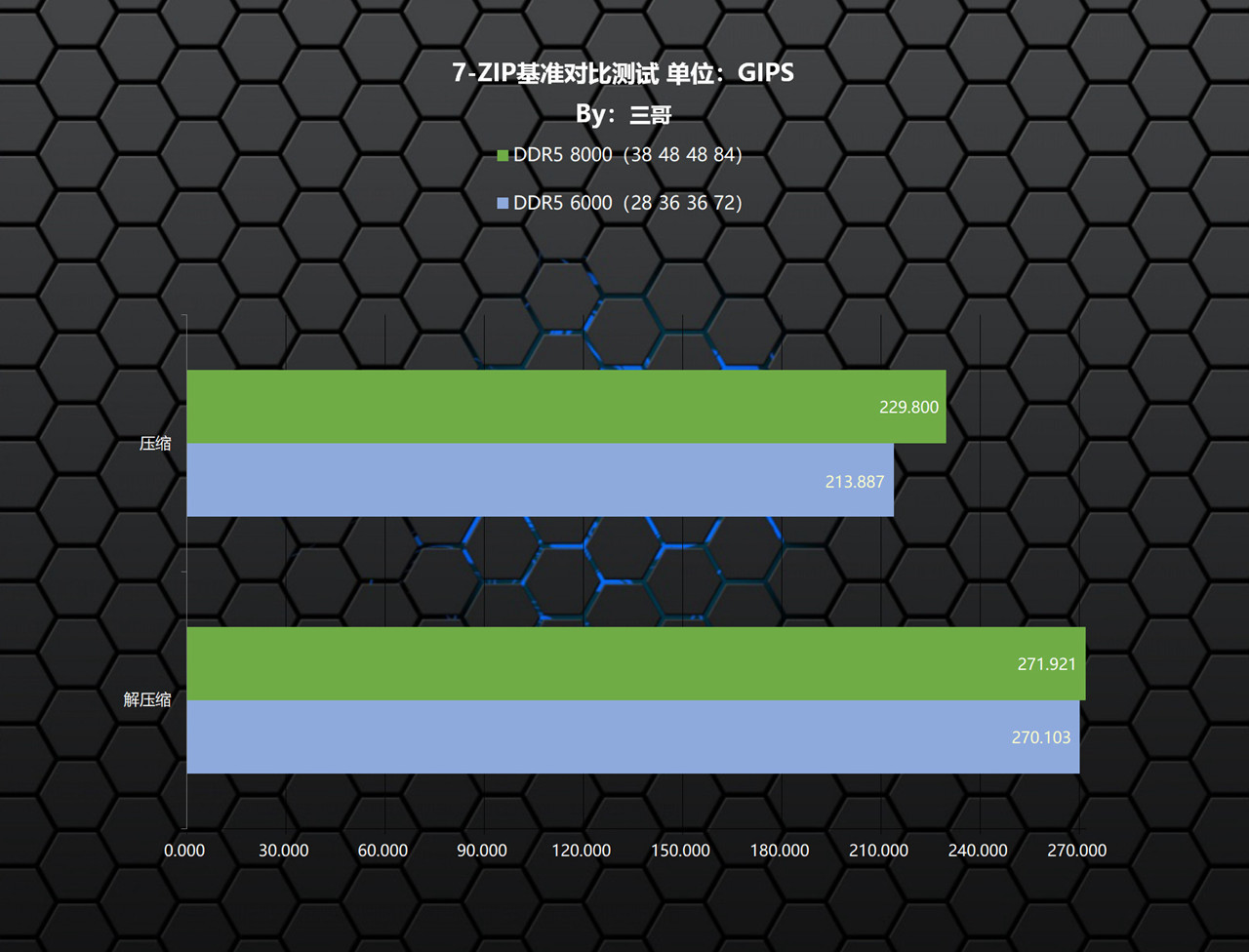 在該測試中,高頻率相較低時序,壓縮性能和解壓性能均有不同程度的領先,其中壓縮性能領先幅度爲7.44%,領先優勢明顯。