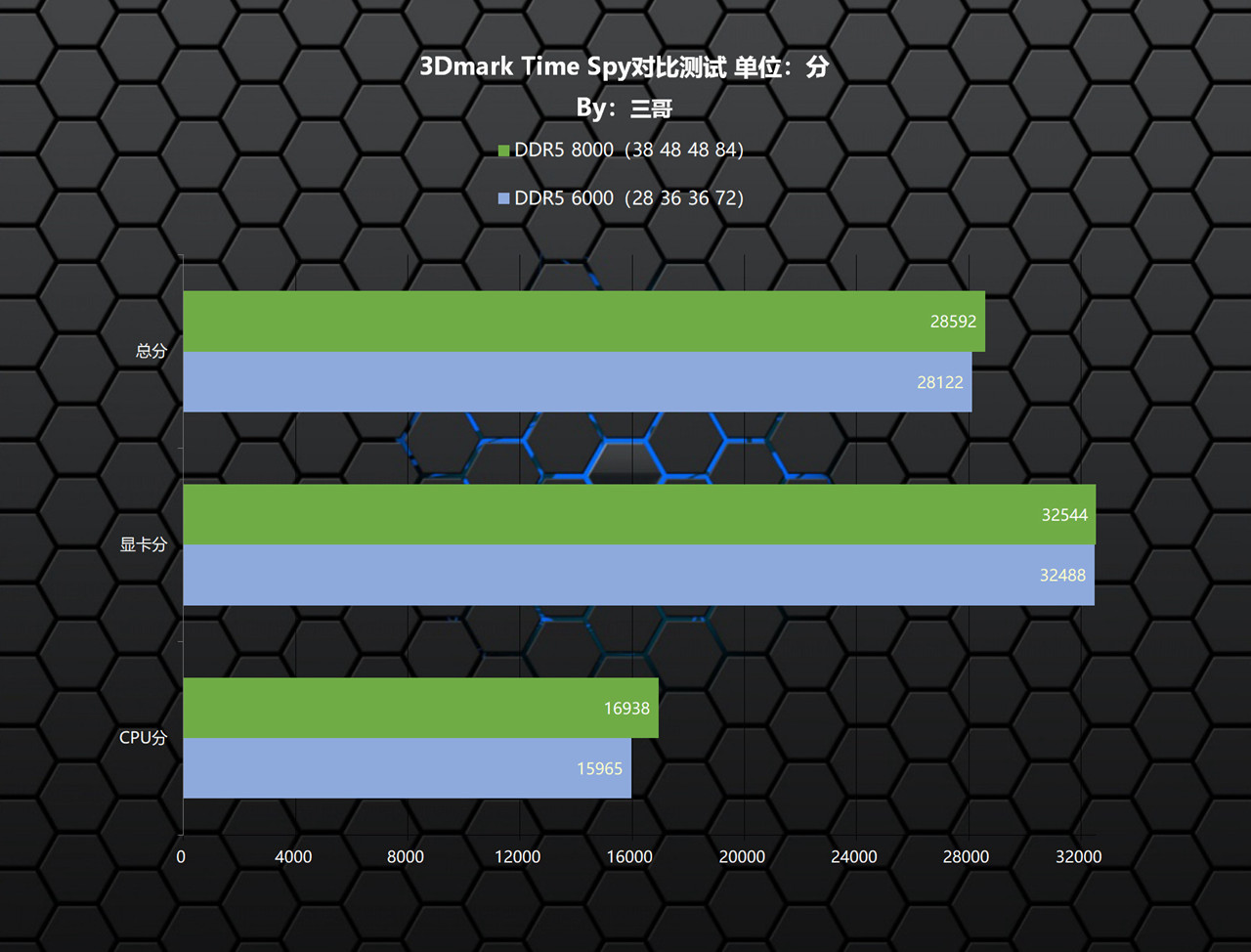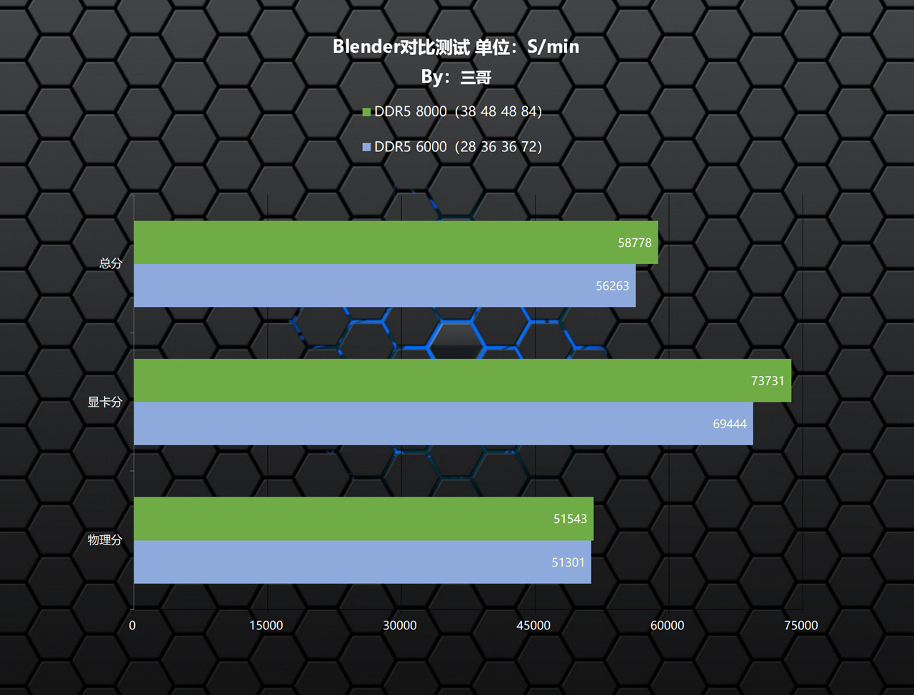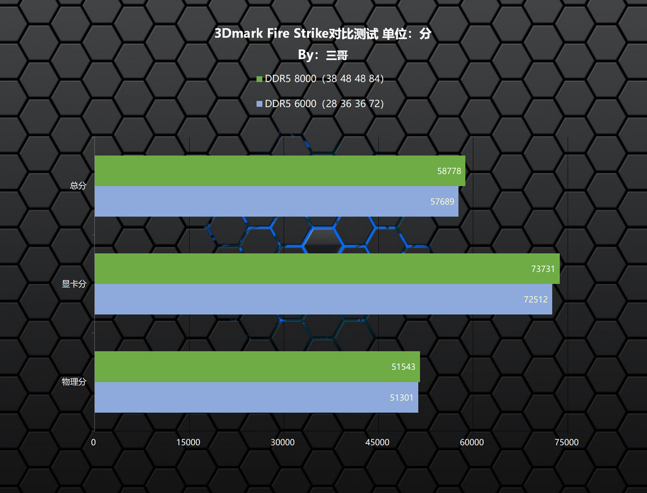 在該測試中,高頻率相較低時序,總分、顯卡分和物理分均有不同程度的領先。