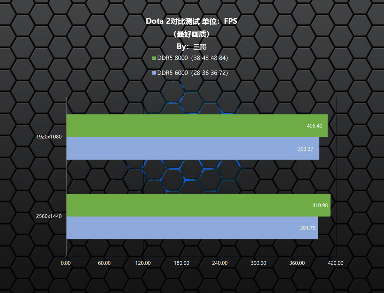 在《Dota 2》測試中,高頻率相較低時序領先優勢明顯,其中在1920x1080分辨率下取得了13.03幀的領先,領先比率3.31%;在2560x1440分辨率下取得了19.23幀的領先,領先比率4.91%。