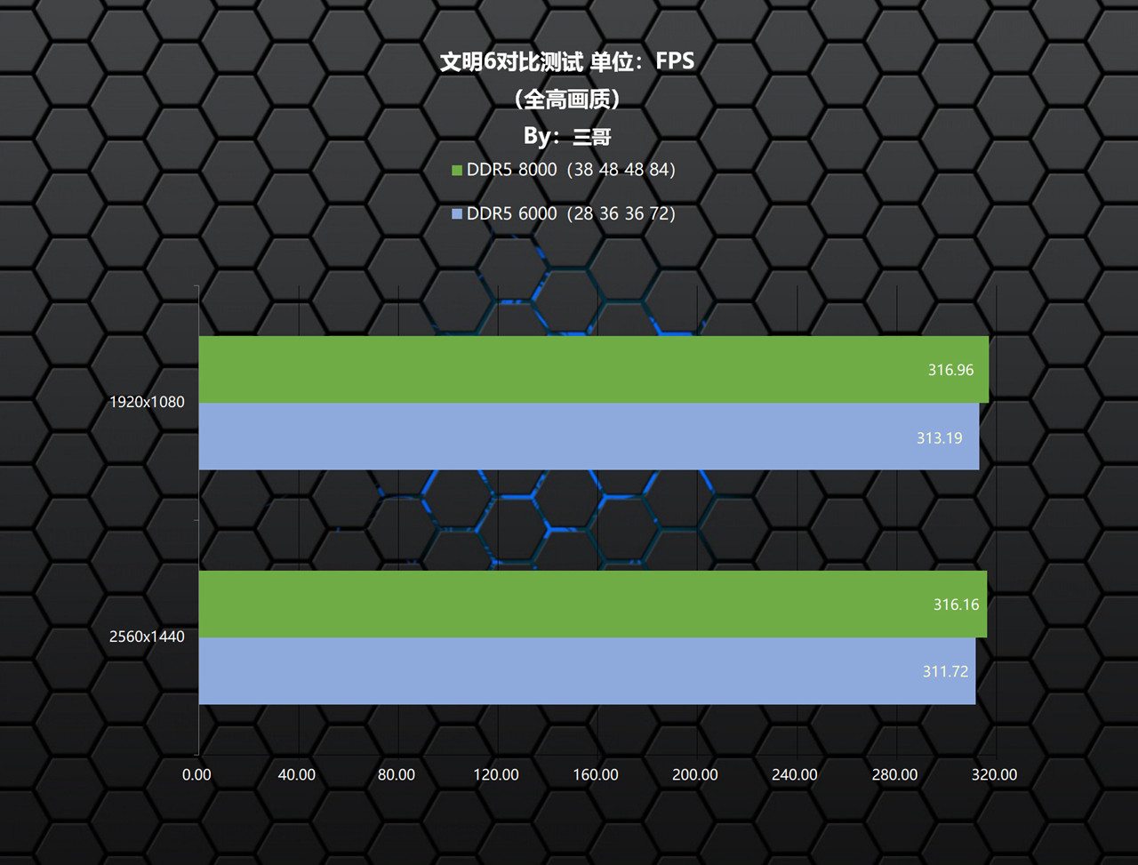 在《文明6》測試中,高頻率相較低時序有小幅度的領先,其中在1920x1080分辨率下領先了3.77幀;在2560x1440分辨率下領先了4.44幀。