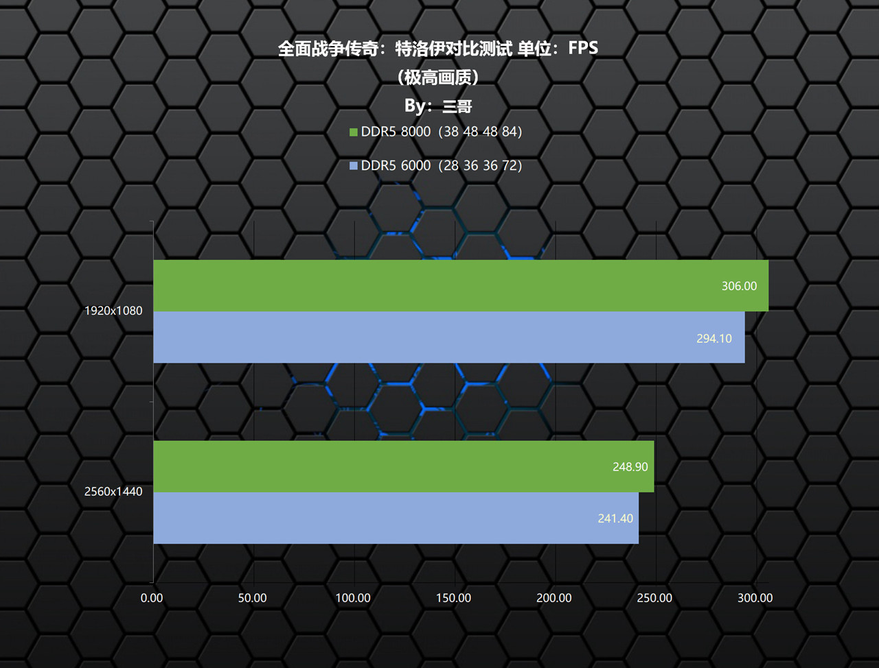 在《全面戰爭傳奇:特洛伊》測試中,高頻率相較低時序有較爲明顯的領先,其中在1920x1080分辨率下領先了11.90幀,領先比率4.05%;在2560x1440分辨率下領先了7.50幀,領先比率3.11%。